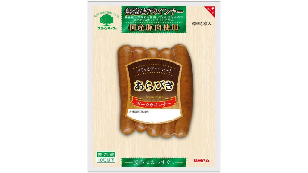 業務スーパーでは無添加ソーセージは見つかりませんでしたが、発色剤(亜硝酸ナトリウム)を使わない無塩せきソーセージなら購入可能です。